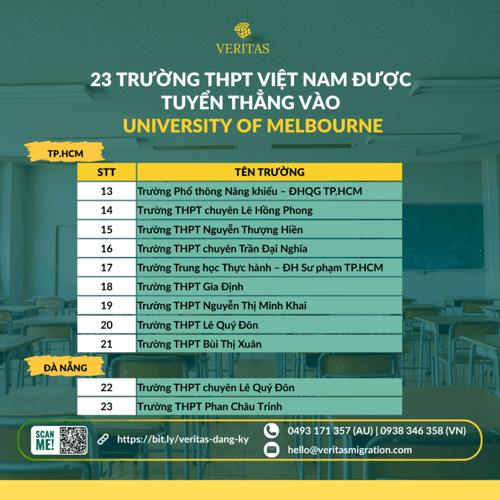 23 trường THPT Việt Nam được tuyển thẳng vào Đại học Melbourne – top 1 nước Úc, top 13 thế giới (QS 2025). Xem danh sách & điều kiện chi tiết!